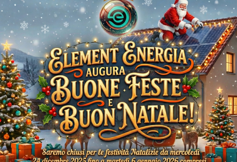 Element Energia informa tutti i clienti che gli uffici resteranno chiusi da mercoledì 24 dicembre a martedì 6 gennaio compresi in occasione delle festività natalizie.